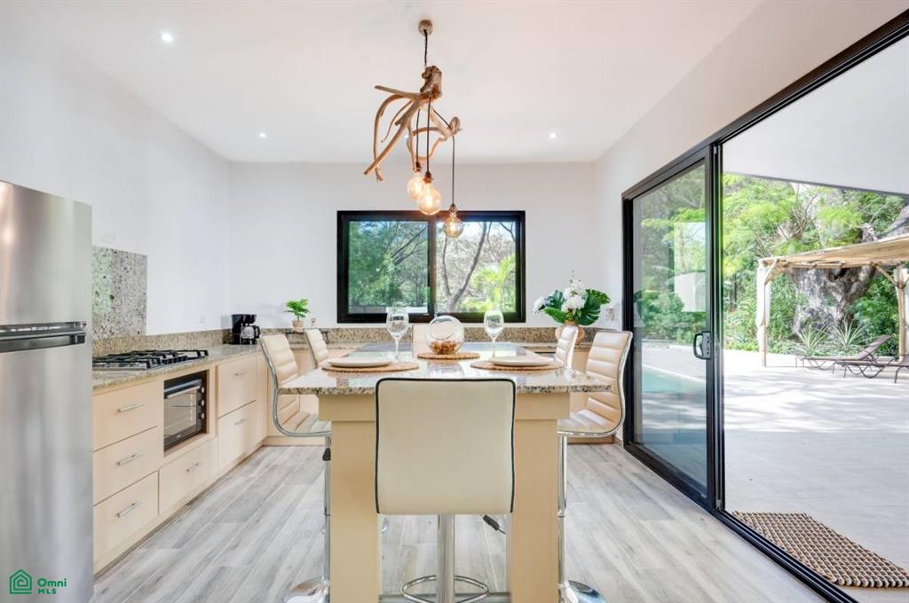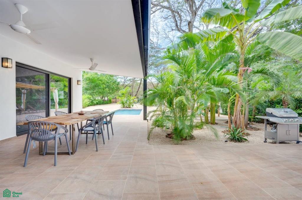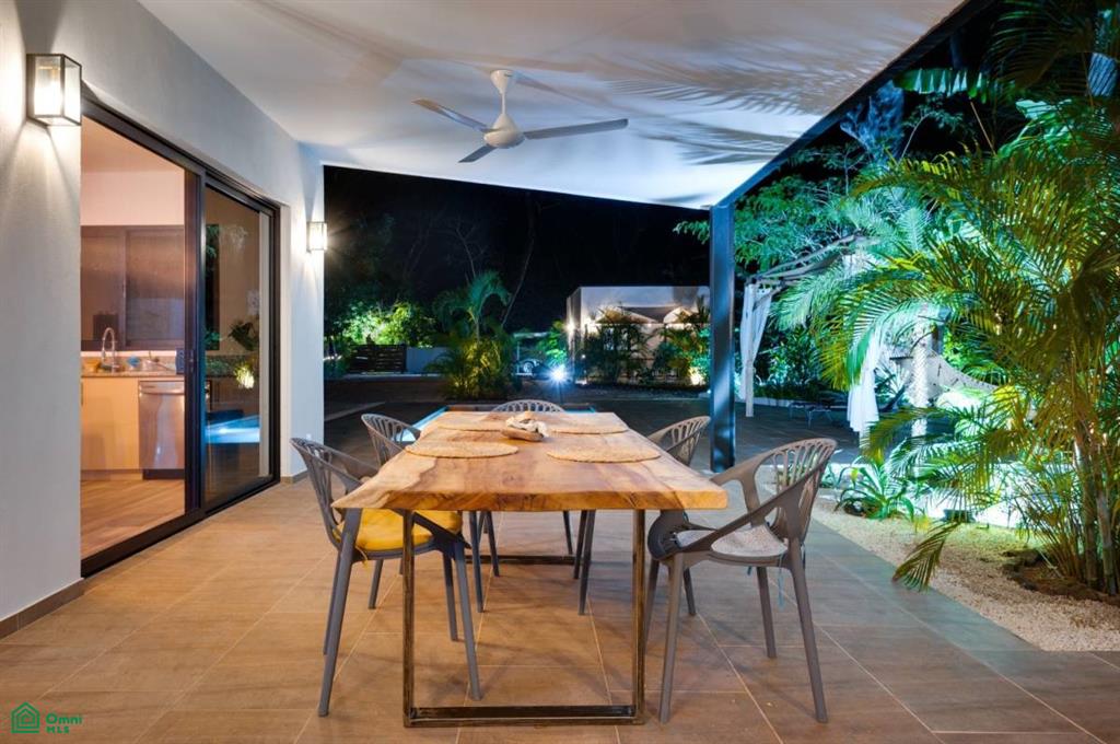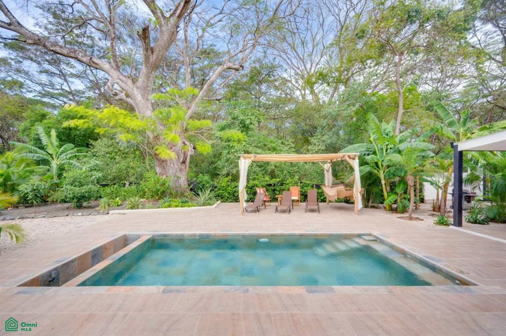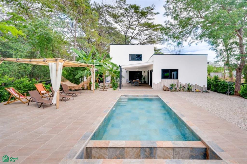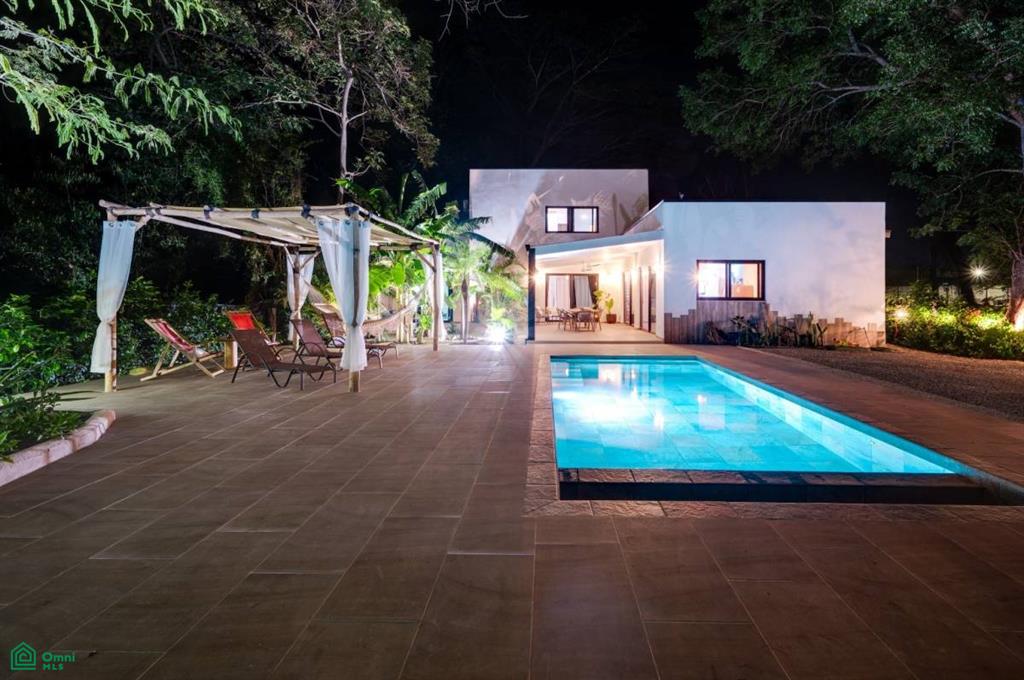 This stunning, modern, fully-equipped villa offers spacious living and high-quality finishes. The 320 m² main house has three bedrooms, each with a private bathroom, as well as a guest bathroom. The master suite is located upstairs, while the other two bedrooms are on the ground floor. Its spacious living, dining, and kitchen reflect an elegant French style and are fully furnished with air conditioning throughout. In addition, the property includes a 62 m² guest house with one bedroom, a bathroom, a kitchen-dining room, and a private terrace, perfect for hosting guests or generating rental income. Outdoors, there is a 24 m² pool surrounded by a 120 m² terrace, a rancho ideal for relaxing, and a tropical garden illuminated at night. A majestic Guanacaste tree provides shade and cool air. The property has an electric gate and a flat 1,423 m² lot, with additional space for future construction. Located in Refundores, just a 15-minute walk from Tamarindo Beach and a 1.6 km drive, it offers privacy and tranquility, as well as proximity to Las Baulas National Marine Park.
